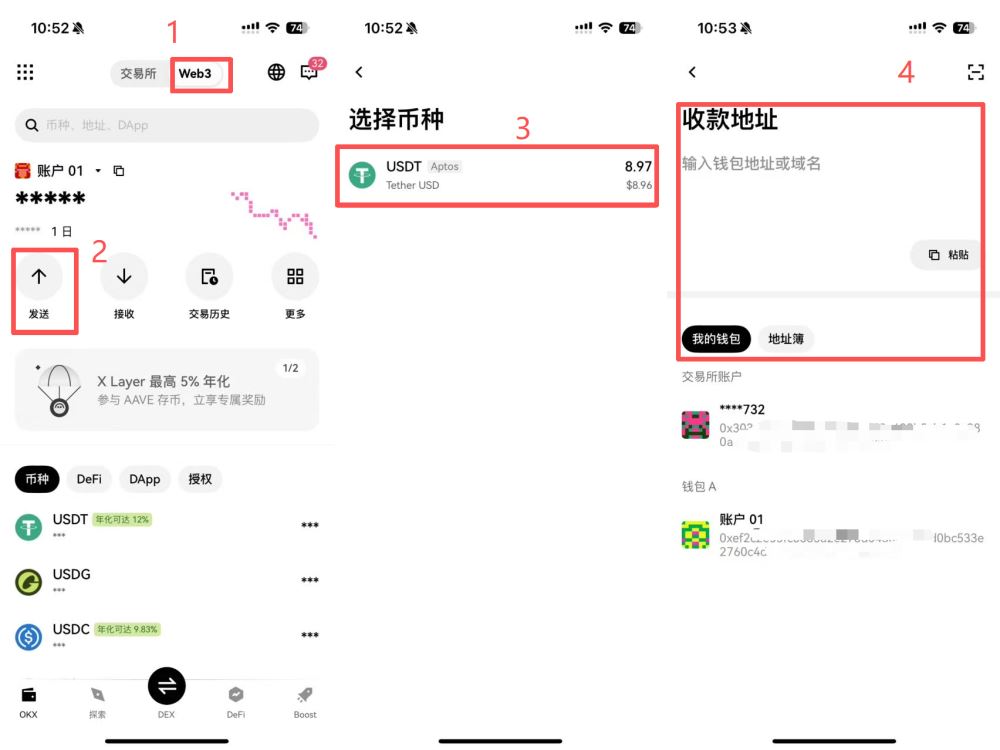 3、打开Web3钱包首页,点击发送,选择您想要充值的币种USDT。