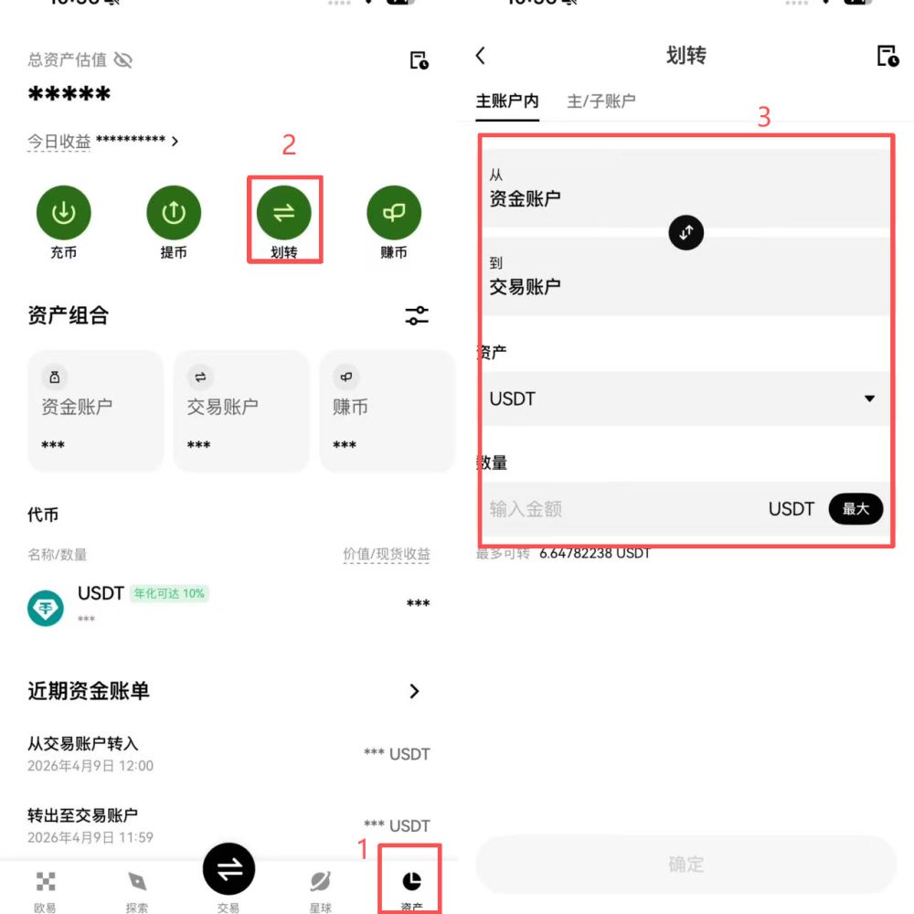 6、选择币种USDT并输入数量,点击确认即可(注意划转方向为现货账户到资金账户)