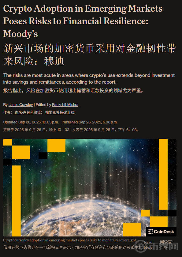 2025 年 9 月,穆迪(Moody』s Ratings)发布的一份报告直接用了一个新词:「cryptoization」——加密资产在货币职能上的扩张,削弱了本国货币和银行体系的地位。(CoinDesk)