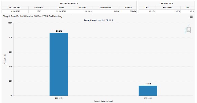 美联储会议前景不明朗:距离十二月只剩四天了美联储会议市场仍不确定杰罗姆·鲍威尔是否会宣布再次降息。降息25个基点的可能性为86.2%而降息50个基点则为13.8%.