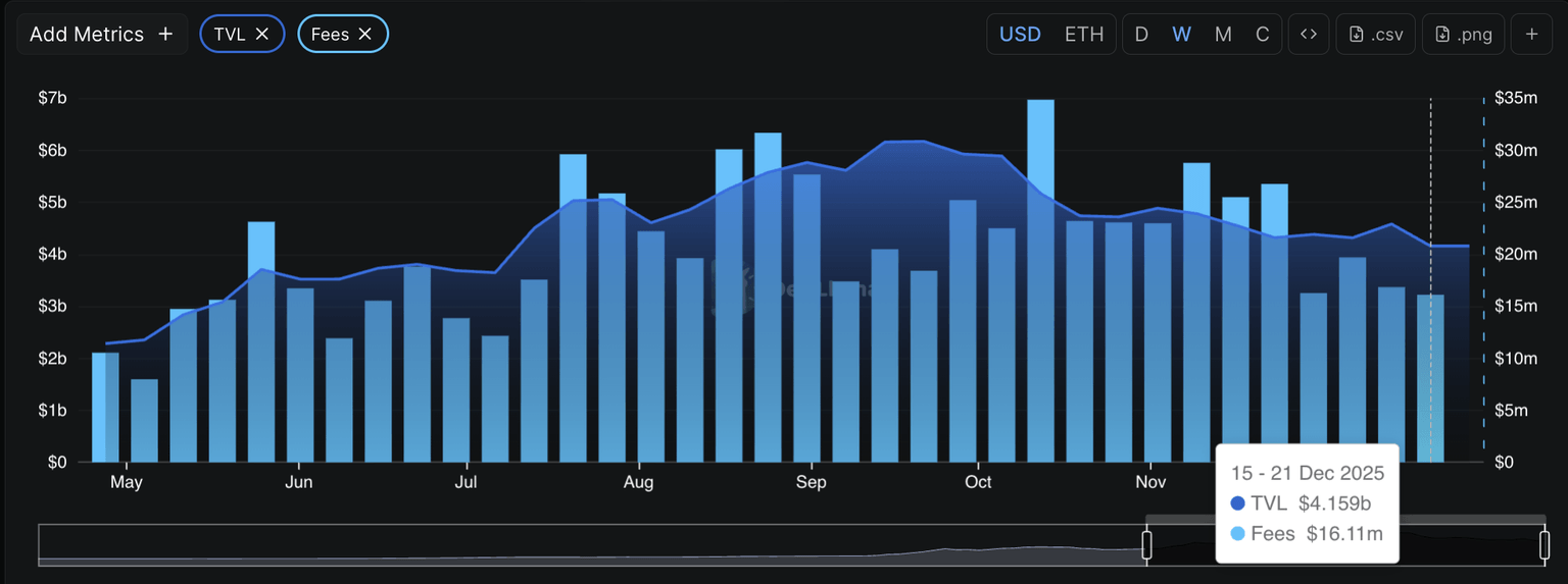 DeFiLlama的数据显示,上周收取的费用总计1611万美元,是12月迄今为止的最低周总额。这表明,尽管用户数量短期内有所回升,但其支付的费用却较低,也反映出其风险偏好较低。