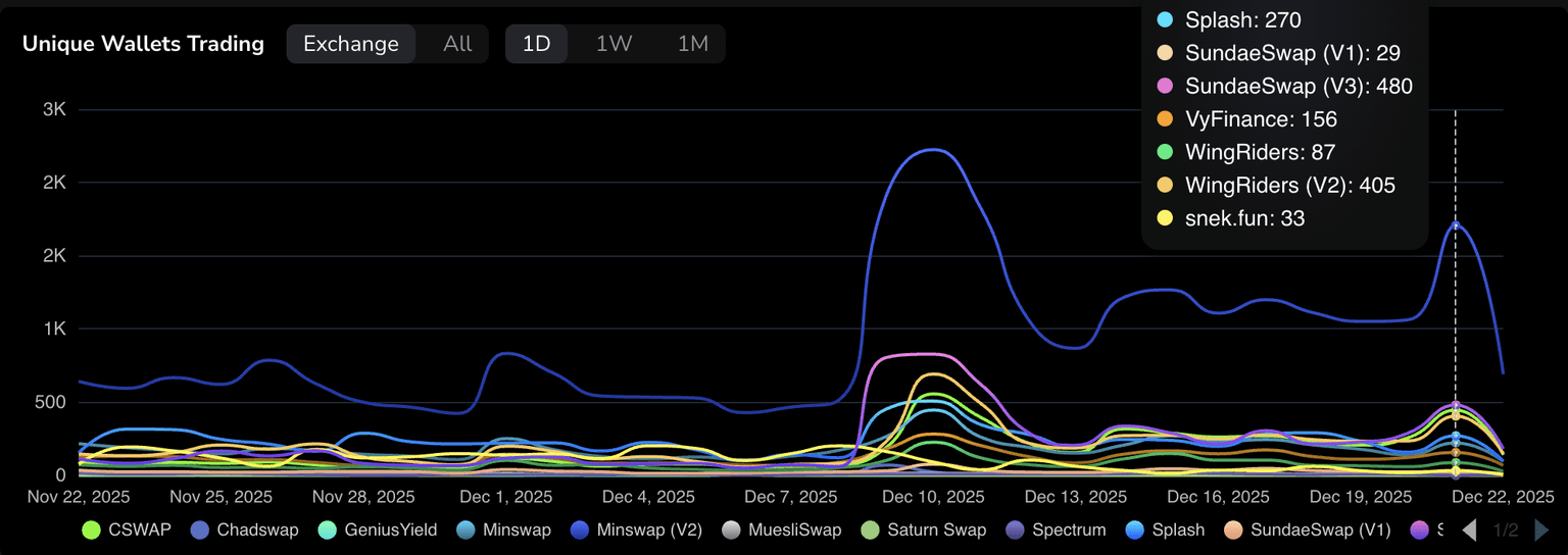 Cardano 的链上活动在 12 月份 Midnight 侧链推出后激增,并在 12 月 10 日达到峰值 1974 万美元。TapTools 数据显示,周日的交易量总计 1611 万美元,高于前一天的 639 万美元。