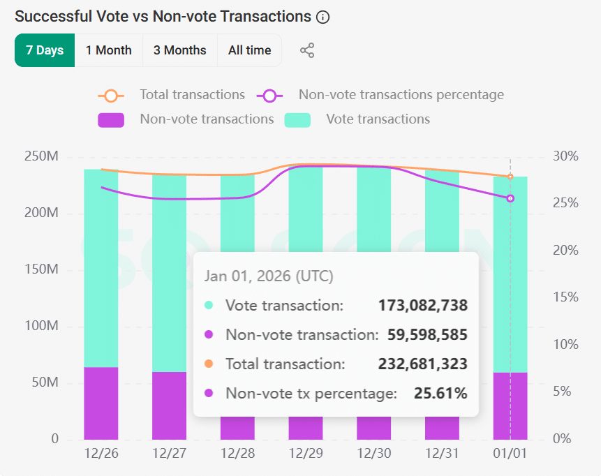 根据上述图表,索拉纳 [SOL]SOL 的总交易量达到 2.32 亿笔,其中约 25% 为非投票交易。相比之下,以太坊的交易量仅为 120 万笔,SOL 的链上表现明显优于以太坊。