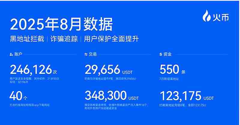 在资产安全与风控方面,火币HTX8月取得一系列可量化成果:累计发送安全提醒246,126次,提前干预潜在风险;打击钓鱼网站及仿冒平台共计40个;成功拦截9笔流向诈 骗地址的提币请求,挽回用户损失29,656U;处理外部被盗资金流入事件16起,冻结涉案资金348,300U;新增黑名单地址550个,阻断黑产充值8笔,涉及金额123,175U。