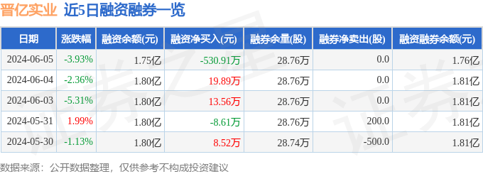晋亿实业融资融券信息显示,融资方面,当日融资买入132.64万元,融资偿还663.55万元,融资净偿还530.91万元。融券方面,融券卖出0.0股,融券偿还0.0股,融券余量28.76万股,融券余额91.46万元。融资融券余额1.76亿元。近5日融资融券数据一览见下表: