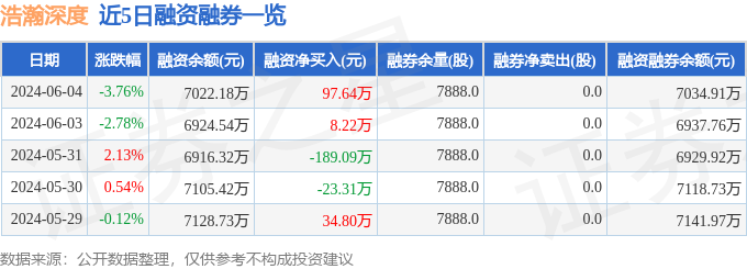 浩瀚深度融资融券信息显示,融资方面,当日融资买入229.17万元,融资偿还131.53万元,融资净买入97.64万元。融券方面,融券卖出0.0股,融券偿还0.0股,融券余量7888.0股,融券余额12.72万元。融资融券余额7034.91万元。近5日融资融券数据一览见下表: