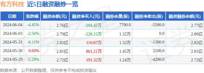 有方科技融资融券信息显示,融资方面,当日融资买入725.23万元,融资偿还1019.65万元,融资净偿还294.42万元。融券方面,融券卖出0.0股,融券偿还5500.0股,融券余量7700.0股,融券余额26.6万元。融资融券余额2.77亿元。近5日融资融券数据一览见下表: