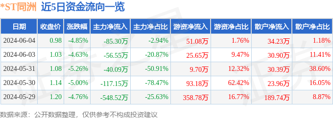 *ST同洲(002052)6月4日主力资金净卖出85.30万元