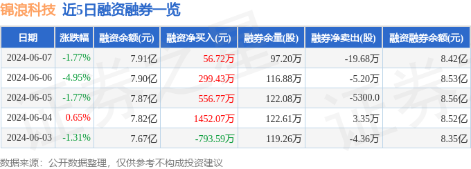 锦浪科技融资融券信息显示,融资方面,当日融资买入1914.0万元,融资偿还1857.28万元,融资净买入56.72万元,连续3日净买入累计912.92万元。融券方面,融券卖出1.07万股,融券偿还20.75万股,融券余量97.2万股,融券余额5083.75万元。融资融券余额8.42亿元。近5日融资融券数据一览见下表: