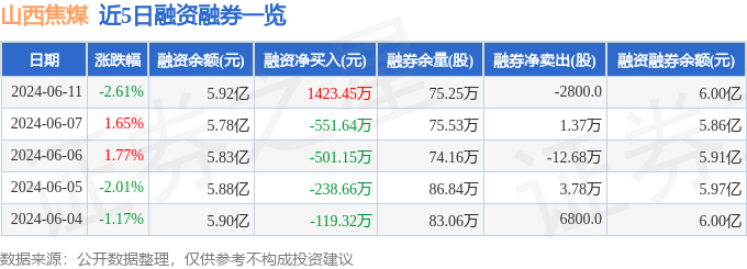 山西焦煤融资融券信息显示,融资方面,当日融资买入2020.61万元,融资偿还597.16万元,融资净买入1423.45万元。融券方面,融券卖出7.46万股,融券偿还7.74万股,融券余量75.25万股,融券余额813.43万元。融资融券余额6.0亿元。近5日融资融券数据一览见下表: