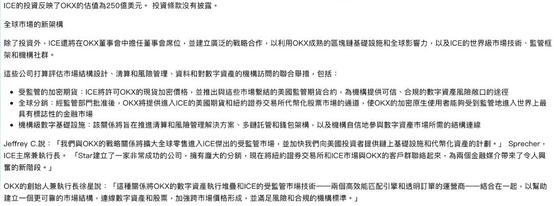 对于ICE 与币安 这次合作,双方并没有公开完整投资条款,因此外界目前也无法精准评估,250 亿美元估值是怎么算出来的。