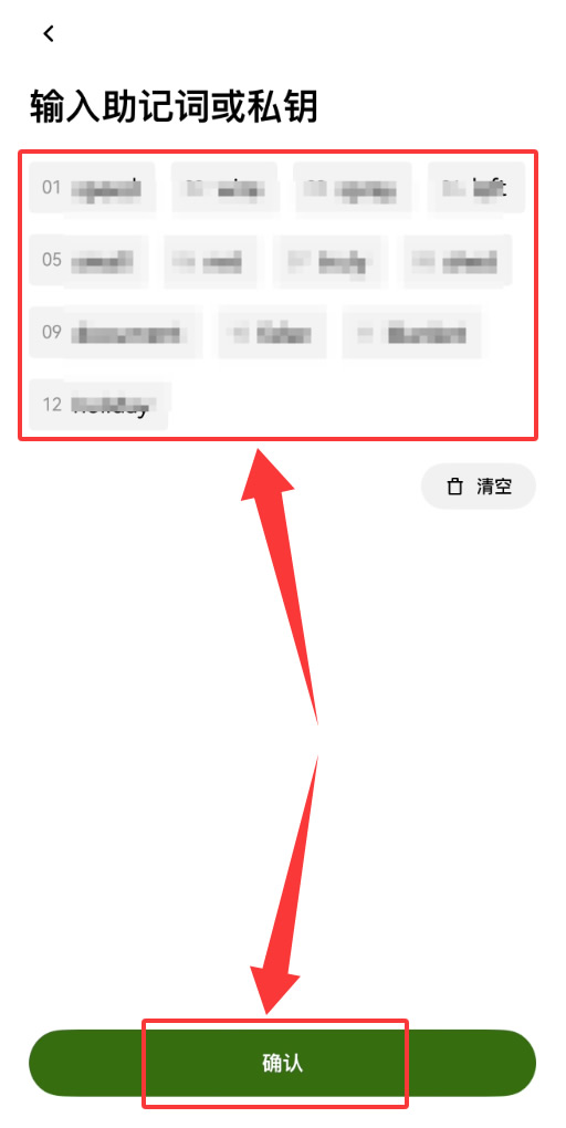 6、按顺序输入刚才从TP钱包导出的助记词。(单词之间用空格隔开)