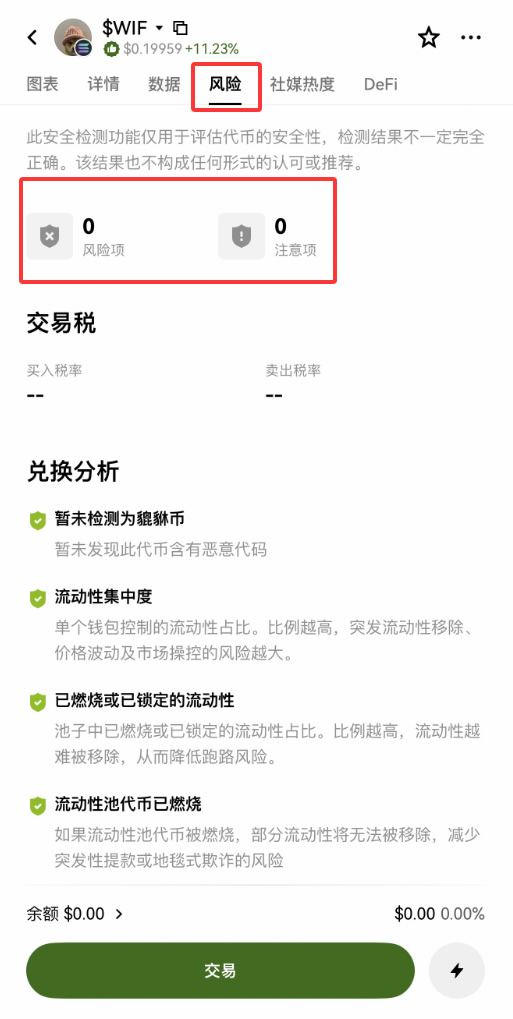 点击右侧的【风险】查看风险项,系统会列出12项安全检测结果,只交易风险较低的币种。