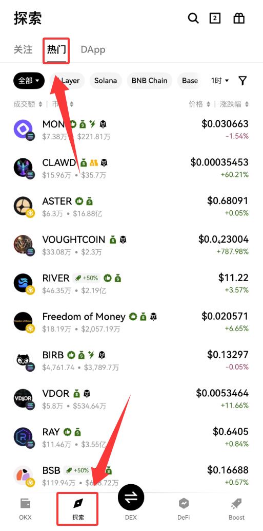 binanceWEB3钱包的交易页面有个热门榜,这里显示的是链上成交额排行。你能看到哪些币种交易最活跃,及时发现市场热点。