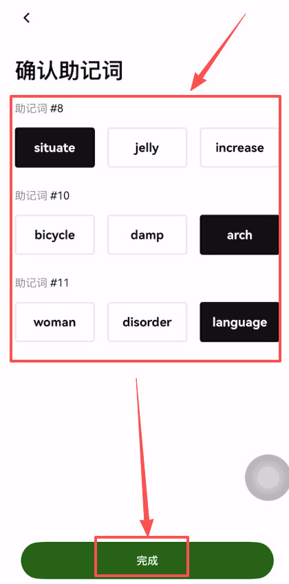 9、接下来来验证一下助记词。点击【完成】。现在我们的Web3钱包就已经创建好了。
