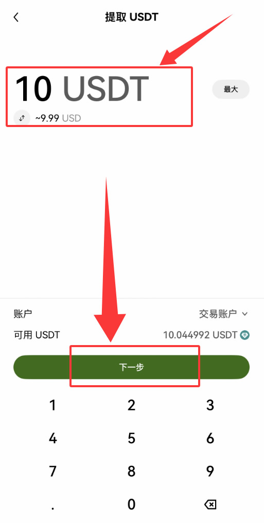 5、进入提取USDT页面,填上你要充值到钱包的USDT数量(比如10U),交易账户选择,下方还为你显示可用USDT数量,咱们按照步骤点击【下一步】即可完成USDT钱包充值流程。