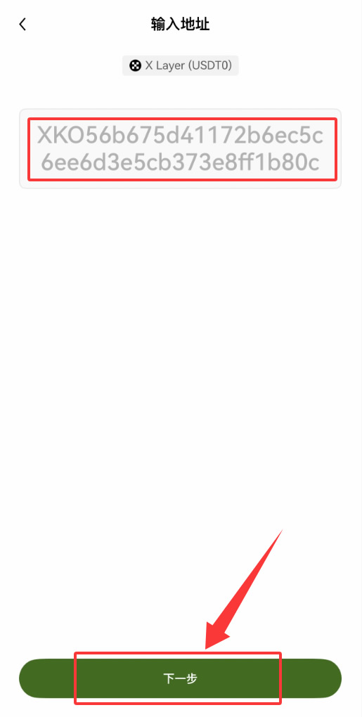 4、输入网络地址,关联成功后,系统会自动填写钱包地址和网络信息,非常便捷。binance自动为大家选择了X Layer网络,地址都贴好了,咱们只需点击【下一步】即可。