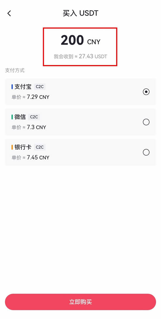 3.选择付款方式,核实确认交易信息无误后,点击“立即购买”,匹配订单。