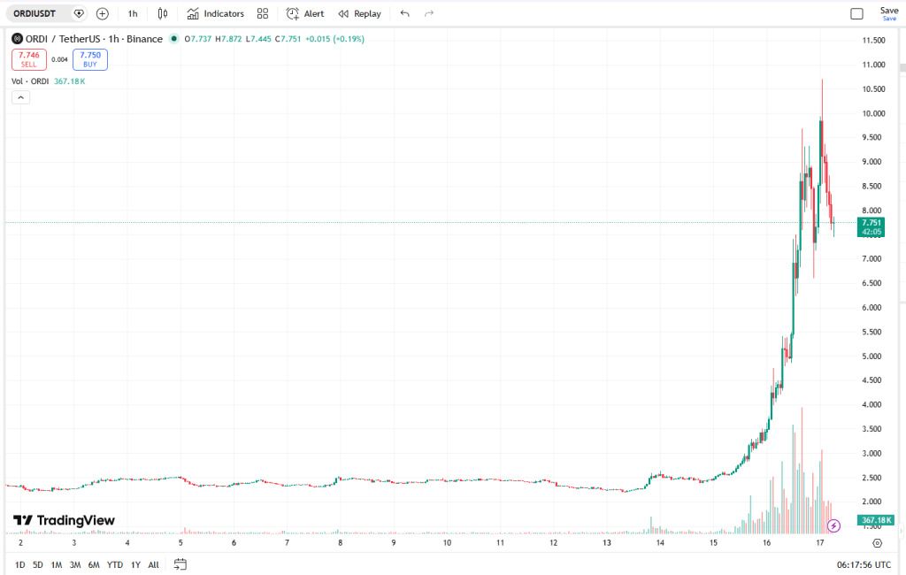 在本月上半月的大部分时间里,ORDI 的价格走势异常平稳,在 2.00 美元至 2.80 美元的狭窄区间内震荡。然而,从 4 月 15 日左右开始,该代币开始呈抛物线式垂直上涨,最高达到 10.70 美元。达到这一峰值后,ORDI 经历了一次急剧且高速的回调——这是抛物线式上涨的常见特征。