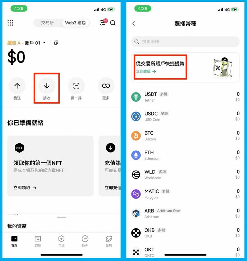 从主页点选接收,进入后点选从交易所帐户快捷提币,就可以直接从币安 帐户转帐到Web3 钱包。