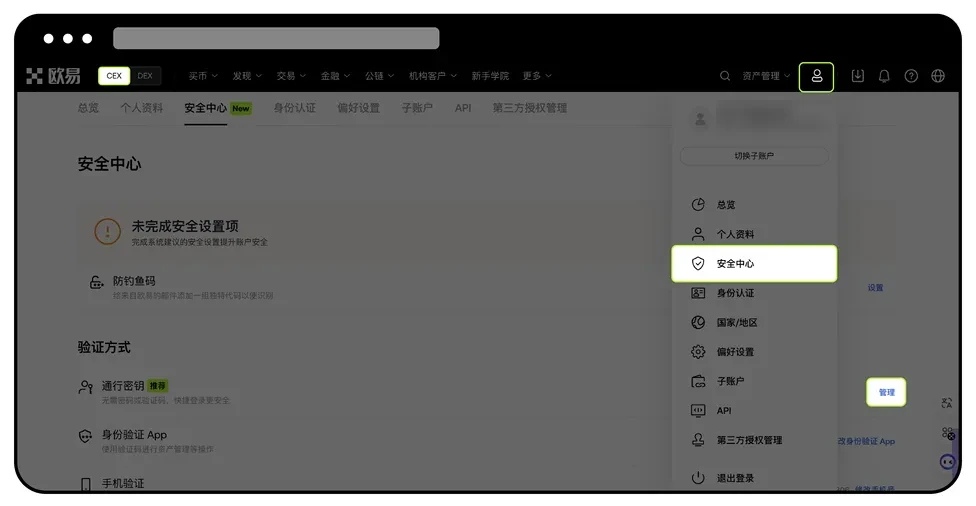 打开官网,点击右上角【个人头像】图标 -【安全中心】,在验证方式选择管理【通行密钥】,然后进行重置即可。