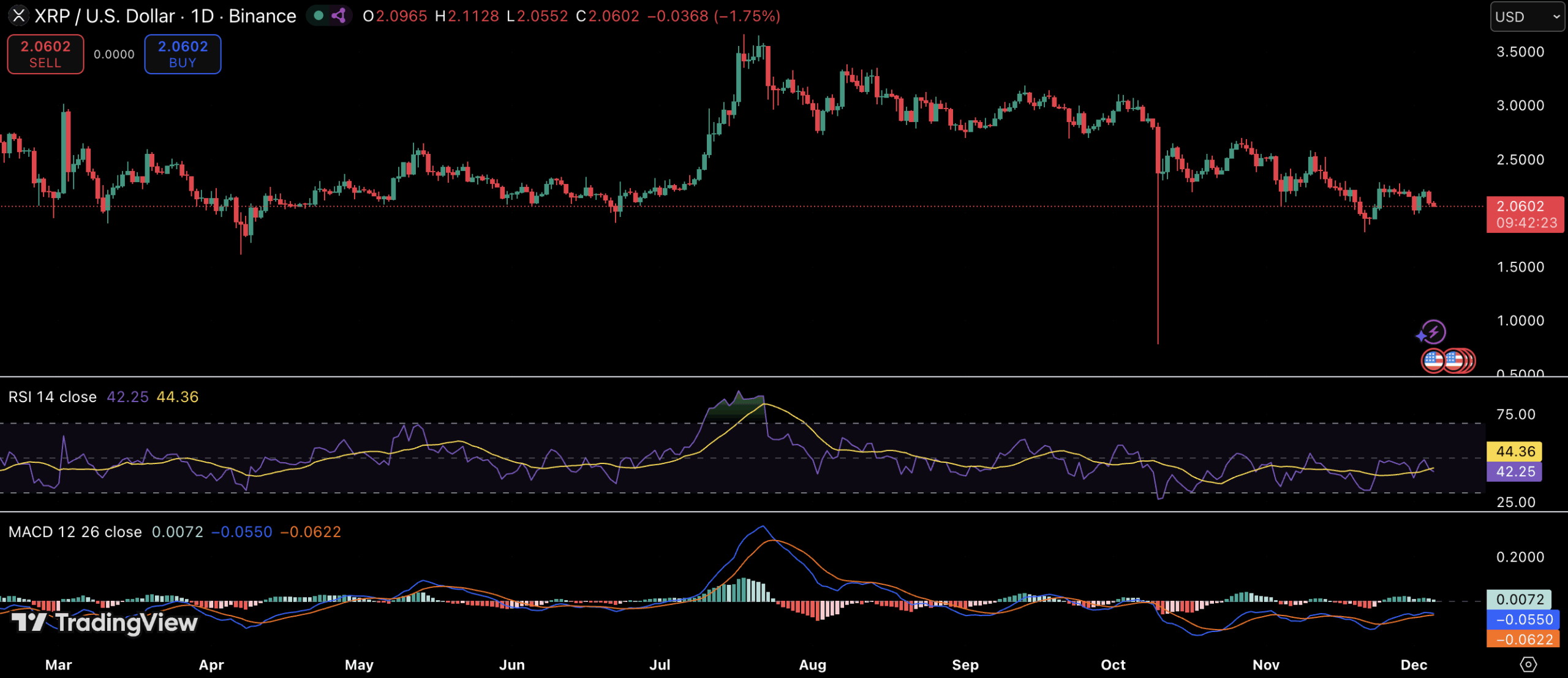 XRP的日线RSI指标徘徊在40左右,交易员通常认为该区域市场波动平缓,但并未出现根本性崩盘。与此同时,MACD柱状图在零轴下方趋于平缓——这是抛售动能减弱而非增强的早期迹象。