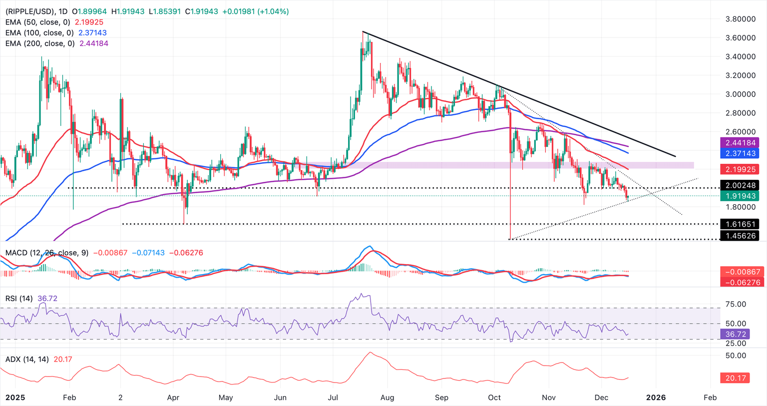 相对强弱指数 (RSI) 为 36.72,低于中线,表明下行压力持续存在。一条自 3.09 美元开始的下降趋势线限制了价格上涨空间,阻力位在 2.11 美元附近。然而,如果收盘价突破该阻力位,则可能引发反弹,目标位在关键的 2.00 美元上方。