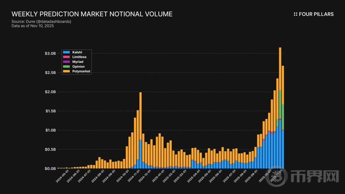 预测市场自 2024 年以来增长迅速: 截至 2025 年 10 月,周名义成交额约为 25 亿美元,周交易次数超过 800 万次。Polymarket 占据了 70–75% 的活动份额,而 Kalshi 在获得 CFTC 批准并扩展到体育和政治市场后,份额攀升至 20% 左右。