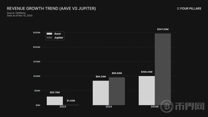 Aave (AAVE) 和 Jupiter (JUP) 持续发布稳定且增长的现金流。Aave 的年度收入从 2023 年的 2975 万美元增长到 2025 年的 9939 万美元。Jupiter 的收入增长更为惊人,从 2023 年的 142 万美元飙升至 2025 年的 2.46 亿美元。