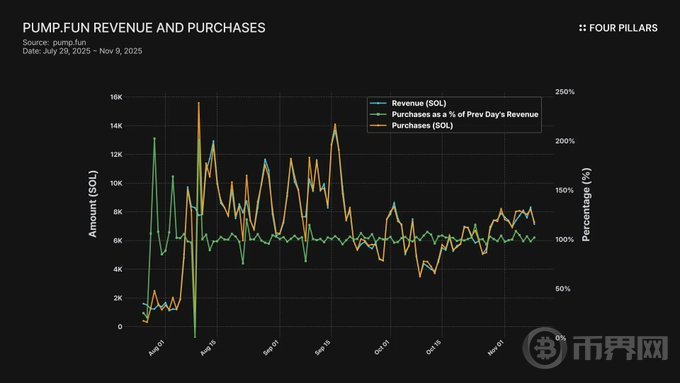 Pump.fun 是领先的迷因币交易平台,产生了约 11 亿美元的累计费用。其回购计划已购买约 83 万枚 SOL(约 1.65 亿美元),相当于其(推测出的)流通价值的 10.3%。