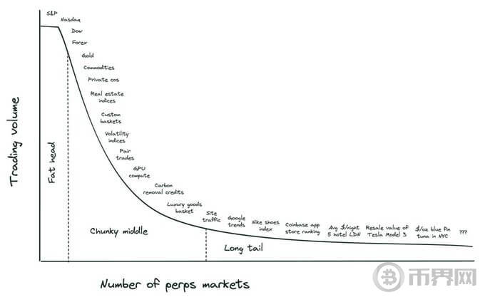 正如 Ventuals 创始人 Alvin Hsia 所描述的,“肥头(Fat Head)”由传统金融已经覆盖的资产类别组成(指数产品、外汇、大宗商品);“厚中段(Chunky Middle)”包括筹得股权、现实世界数据集和大宗商品指数;而“长尾(Long Tail)”则延伸到利基信号,如局部房地产价格、产品溢价或文化趋势指数。传统金融无法轻易将这些数据点商品化,但链上结算系统可以。 HIP-3 实际上开启了需求驱动的市场创建模式。