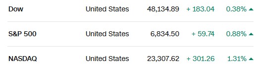 美国股市周五收高,标普500指数上涨0.88%,纳斯达克100指数上涨1.31%,道琼斯指数上涨183点(涨幅0.38%),科技股领涨。英伟达股价上涨3.9%,而耐克股价则因中国市场营收疲软和关税上调而下跌11%。