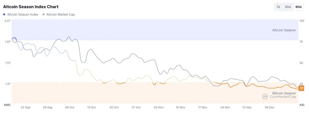 当前的市场低迷反映了宏观经济紧缩、监管延迟以及机构规避风险。比特币的市场份额正在上升。山寨币