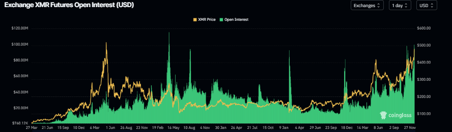 衍生品方面,CoinGlass的数据显示,门罗币期货在交易所的未平仓合约(OI)周日飙升至9970万美元,高于12月10日的5401万美元,目前为9542万美元。未平仓合约的增加意味着有新的资金或额外的资金进入市场,以及新的买盘,这可能会推动当前的门罗币价格上涨。