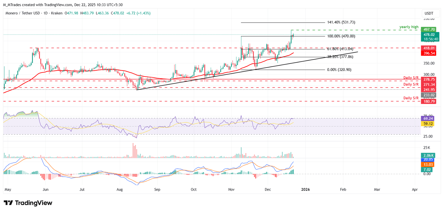 截至周一发稿时,门罗币 (XMR) 的交易价格继续保持在 477 美元上方,此前一周该币种创下年度新高。链上和衍生品数据均显示出看涨信号,加上积极的技术形态,预示着门罗币价格有望突破 500 美元。