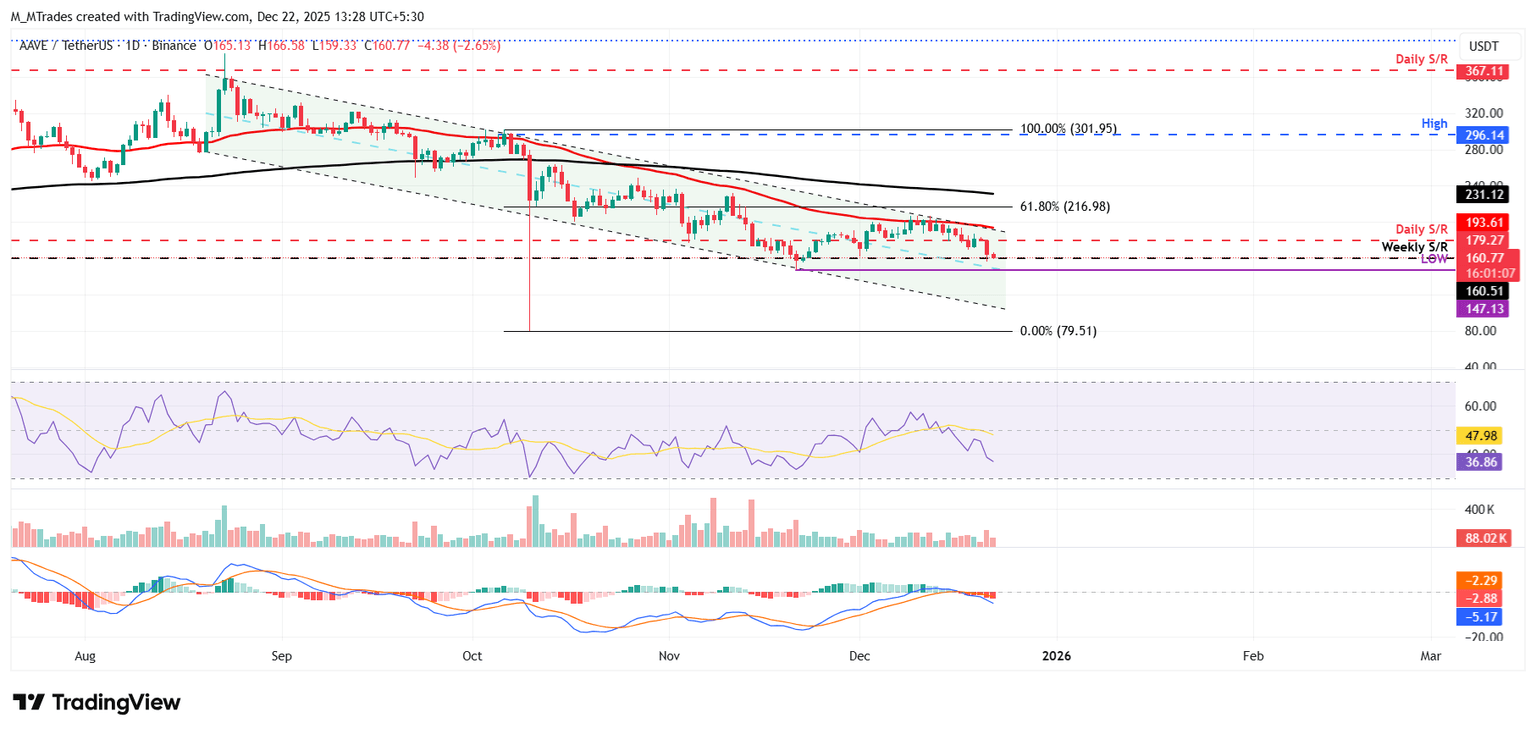 周一,Aave (AAVE) 价格继续下跌,跌破 162 美元,此前一周已下跌超过 12%。链上数据显示,巨鲸钱包正在增加代币销售,而 AAVE 的动量指标也持续转负,预示着未来几天可能进一步回调。