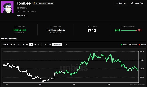 上述预测清单几乎覆盖了 2025 年的大部分时间节点, 在 unbias fyi 的 Fundstrat 分析页中,Tom Lee 被标注为 “Perma Bull(长期多头)” 每一次发声都会给予市场更高的目标价和更乐观的期限展望。然而,这些激进预测与现实走势相去甚远。这一系列事实令市场开始质疑,“华尔街神算子” Tom Lee 的可信性。