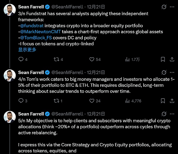 表示 Fundstrat 内部有多位分析师,各自采用独立的研究框架与时间尺度,以服务不同类型客户的目标;其中 Tom Lee 的研究更面向传统资产管理机构与“低比例配置”投资者(通常仅将 1%–5% 资产配置至 BTC/ETH),强调长期纪律与结构性趋势,而其本人则主要服务加密资产占比较高的组合(约 20% )。但是 Tom Lee 本人在公开喊多 ETH 时并未声明自己是面向 “1%–5% 资产配置至 BTC/ETH” 的群体。