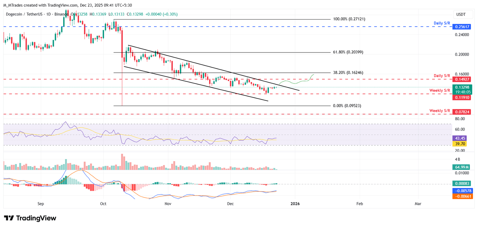 假设狗狗币 (DOGE) 突破下降楔形形态,这有利于上涨行情。涨势可能延续至 0.14 美元的日线阻力位。若成功收于该阻力位上方,则可能进一步上涨至 38.20% 的水平。斐波那契回撤位在 0.16 美元。