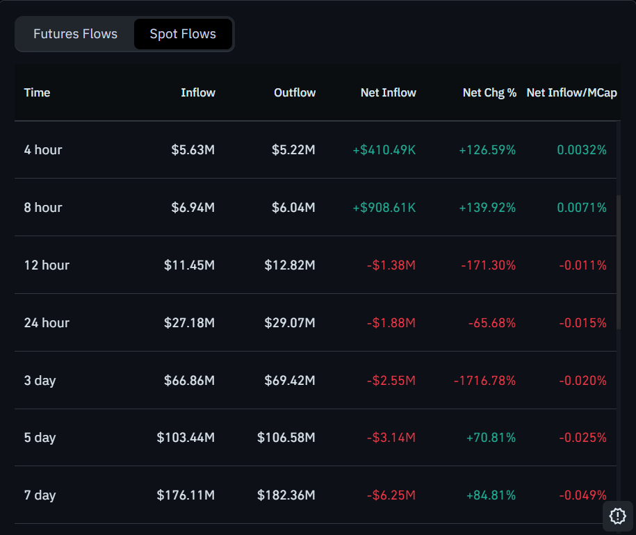 8 小时现货交易量也反映出 90.861 万美元的净流入,增幅达 139.92%,表明短期买盘活跃。然而,12 小时和 24 小时现货交易量则出现下滑,分别净流出 138 万美元和 188 万美元,表明市场存在一定的看跌情绪。