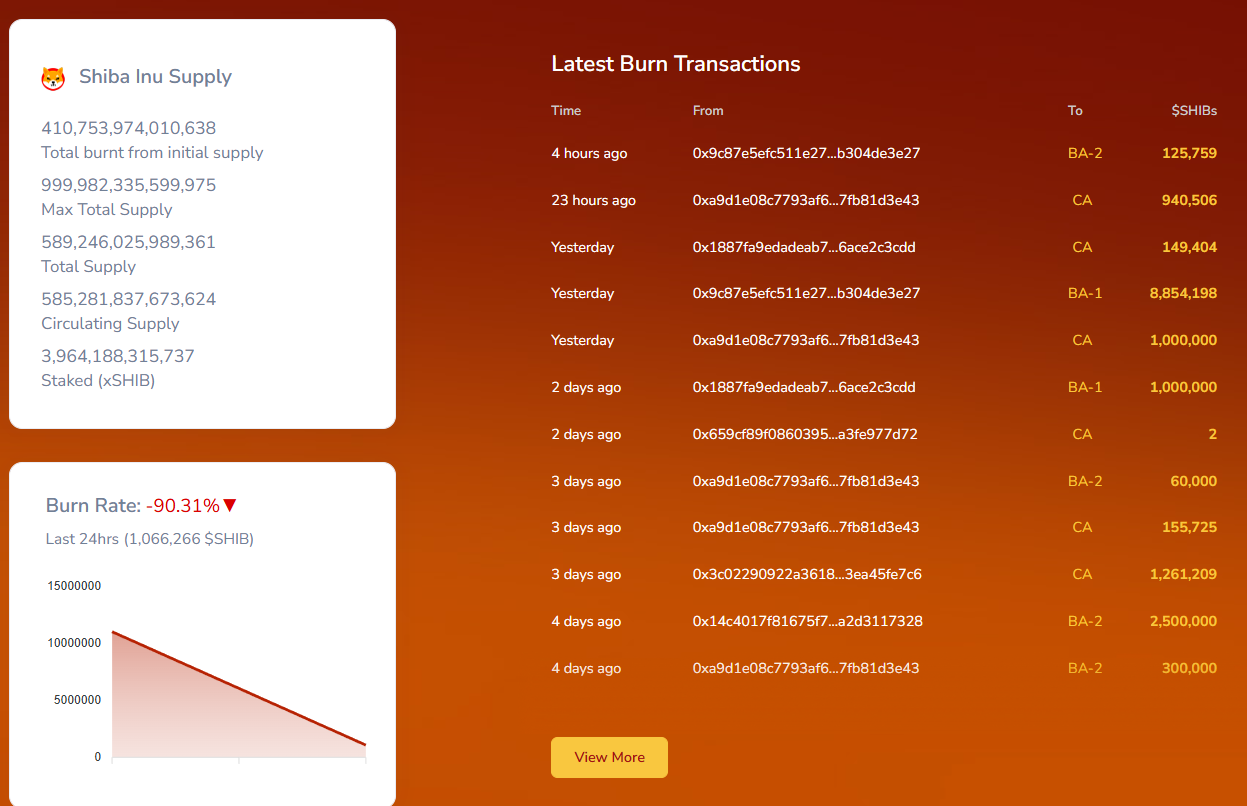 两天前也发生了其他大规模销毁事件,两笔交易共销毁了200万枚SHIB代币。尽管近几日销毁速度有所放缓,但持续进行的销毁工作仍然在减少总供应量和潜在地加剧稀缺性方面发挥着至关重要的作用。