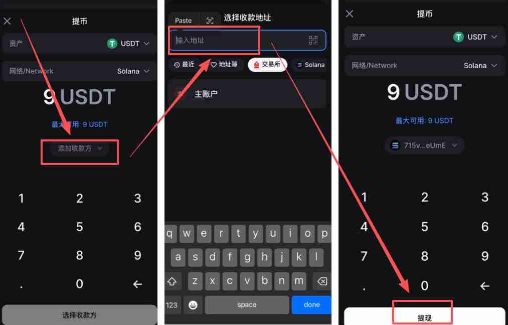 4、提现的品种还是USDT,网络我还是使用Solana网络,提现的数量我选择全部。这里需要添加收款方式,这个时候我们就可以回到币安。