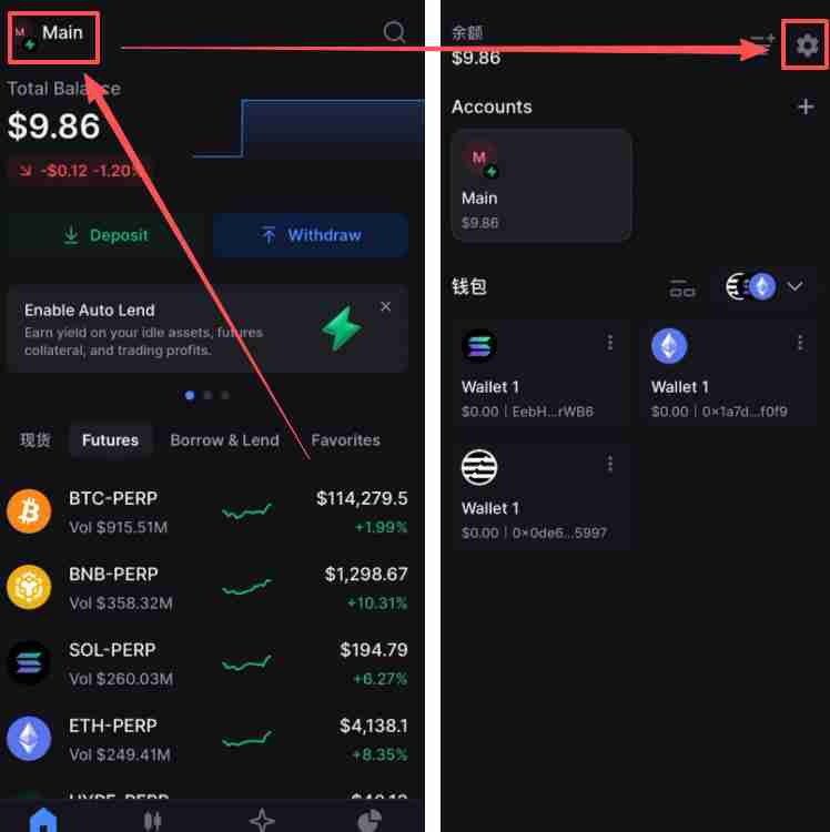 14、身份认证成功之后,我们就能够往backpack交易所里面去充钱了。如果进来之后你发现它都是英文,我们就可以点击左上角,再点击右上角的设置。