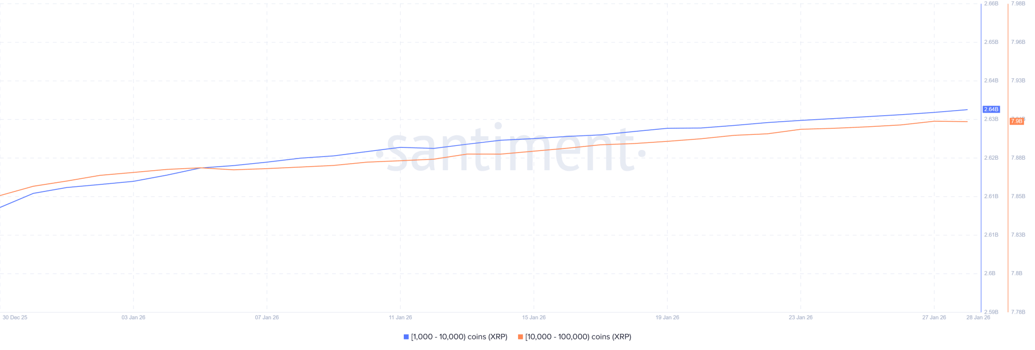 截至 2026 年 1 月,持有 100 万至 1 亿枚 XRP 代币的巨鲸已累计持有价值 7.1 亿美元的 XRP 代币。