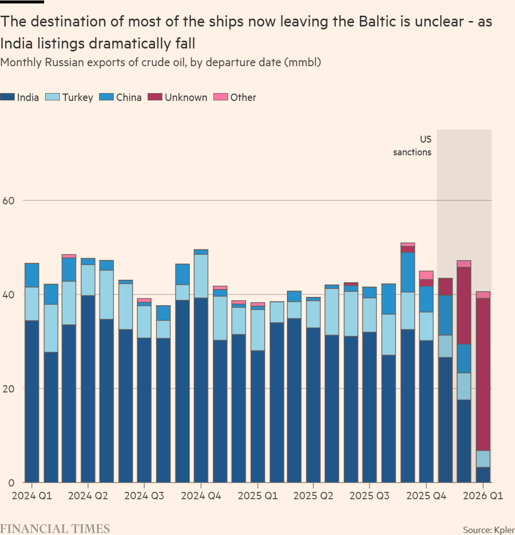 目前从波罗的海启航的大多数船只的目的地尚不明确,而运往印度的原油量大幅下跌