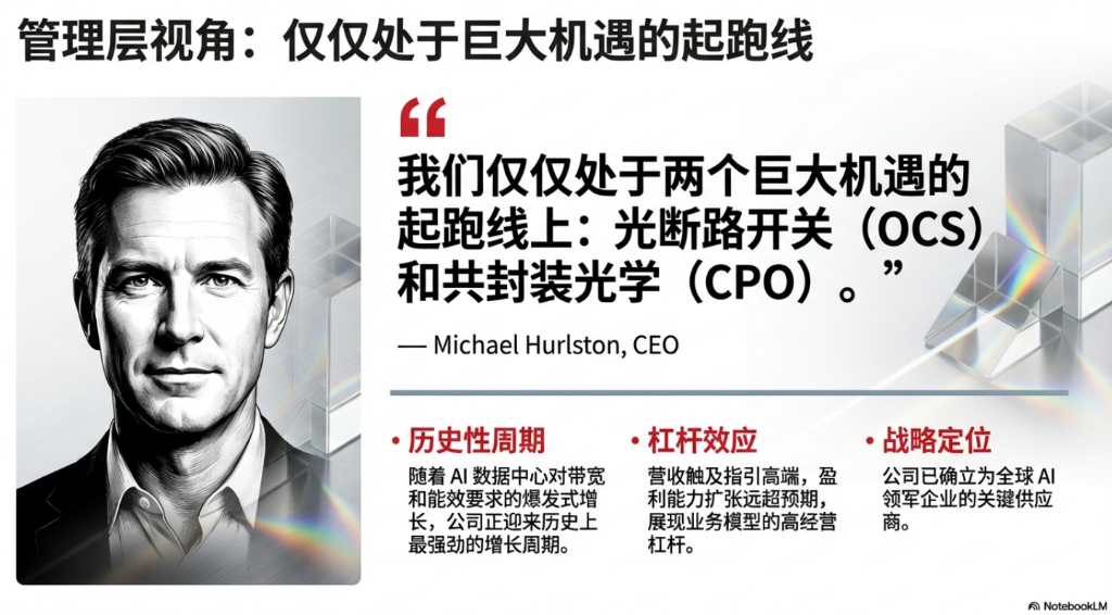公司管理层特别强调了光电路交换机(OCS)和共封装光学器件(CPO)两大业务的爆发性增长潜力。
