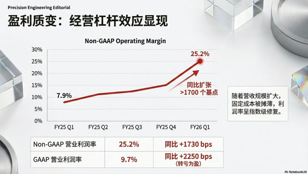 营业利润层面改善更为显著。GAAP营业利润率从上季度的1.3%跳升至9.7%,同比更是实现了2250个基点的巨幅改善,从去年同期的-12.8%转为正值。Non-GAAP营业利润率达到25.2%,环比提升650个基点,同比扩张1730个基点,远高于去年同期的7.9%。