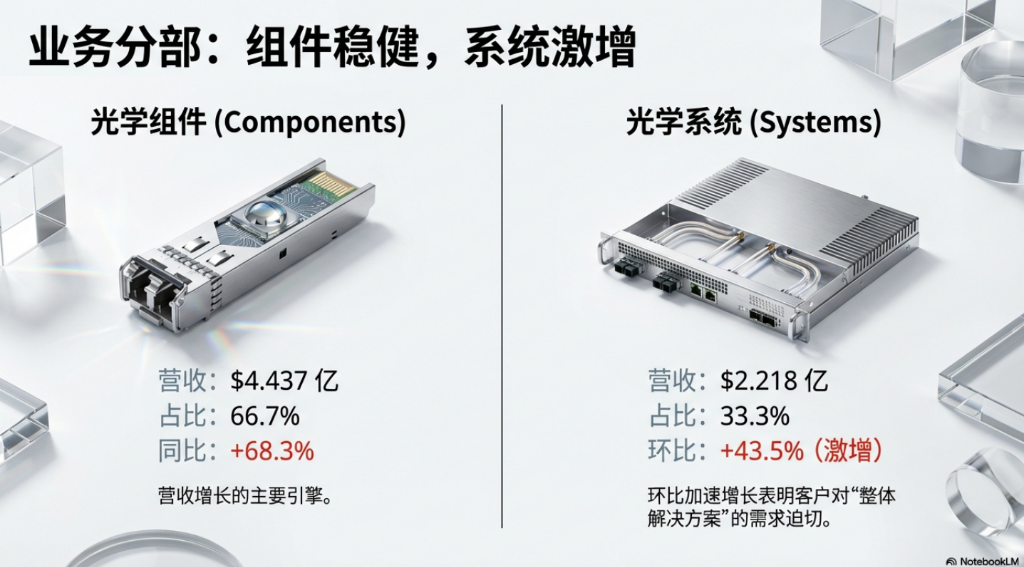 组件业务本季度营收达到4.437亿美元,占总营收的66.7%,环比增长17.0%,同比大涨68.3%,成为营收增长的主要引擎。