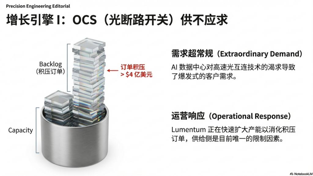 在OCS领域,Lumentum正在快速扩大产能以满足非同寻常的客户需求,当前订单积压已超过4亿美元,这一数字凸显了AI数据中心对高速光互连技术的巨大需求。