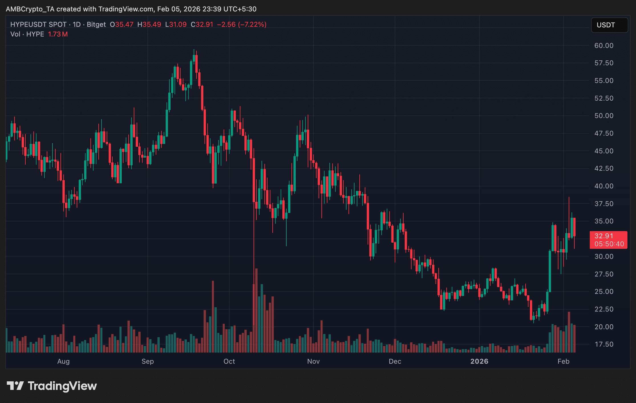 截至发稿时,HYPE 的交易价格接近32.9美元下降超过当日涨幅7%。延续了自 10 月份以来一直存在的更广泛的下跌趋势。